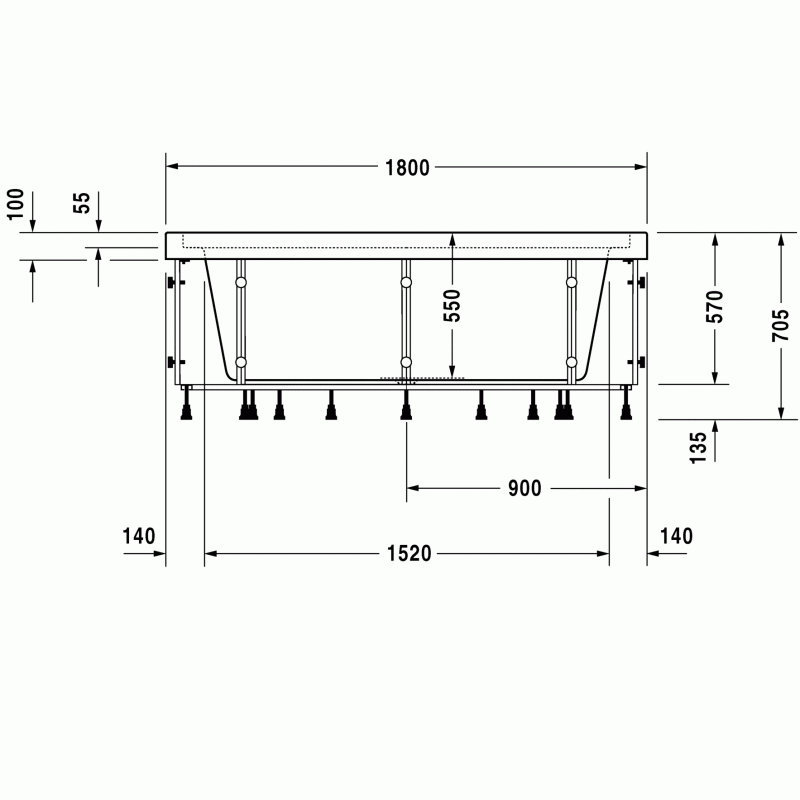 Duravit Blue Moon ванна квадратная 180 см с ножками, с переливом. Характеристики ванны:Ширина180 смГлубина55 смДлина180 смОбъем730 лВес115,5 кгМатериал: санитарный акрил