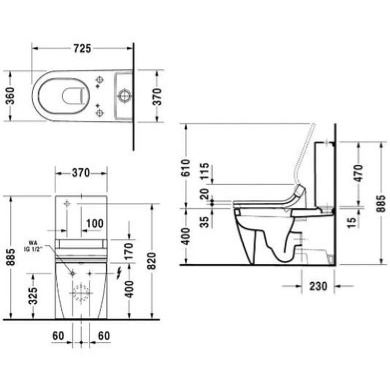Схема с размерами унитаза-компакта Duravit Starck 2 SensoWash (2129590000)