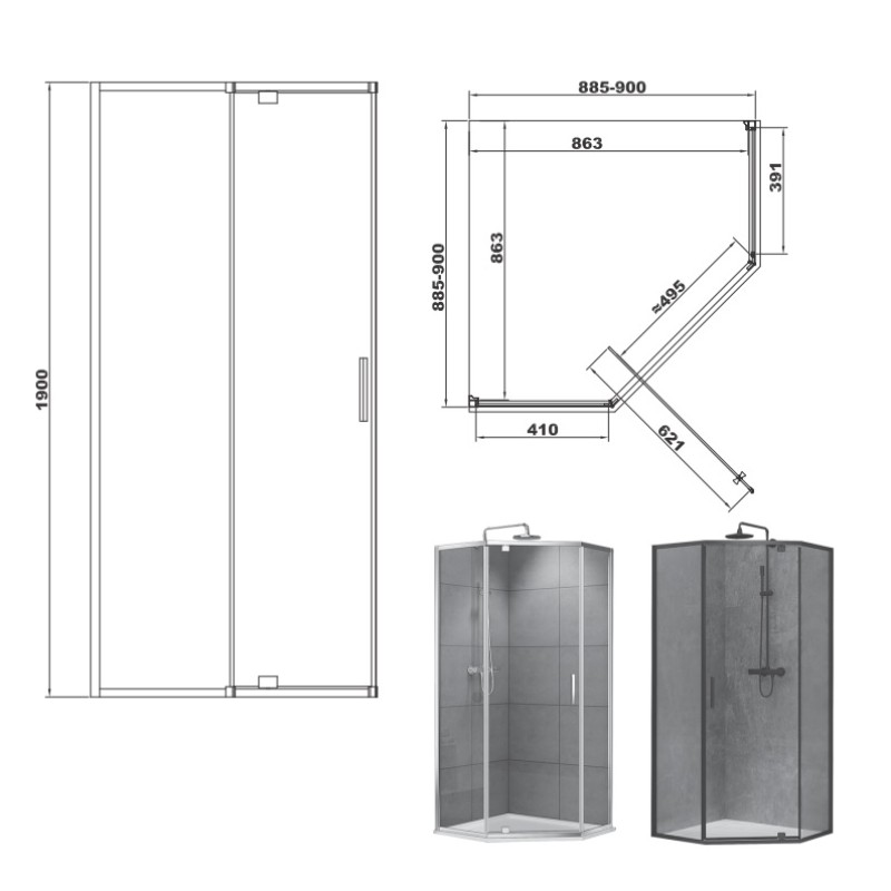 DEVIT FEN0140B ART 2.0 Кабина душевая, пятиугольная, распашная, цвет - чёрный матовый, 90х90, без поддона, стекло прозрачное