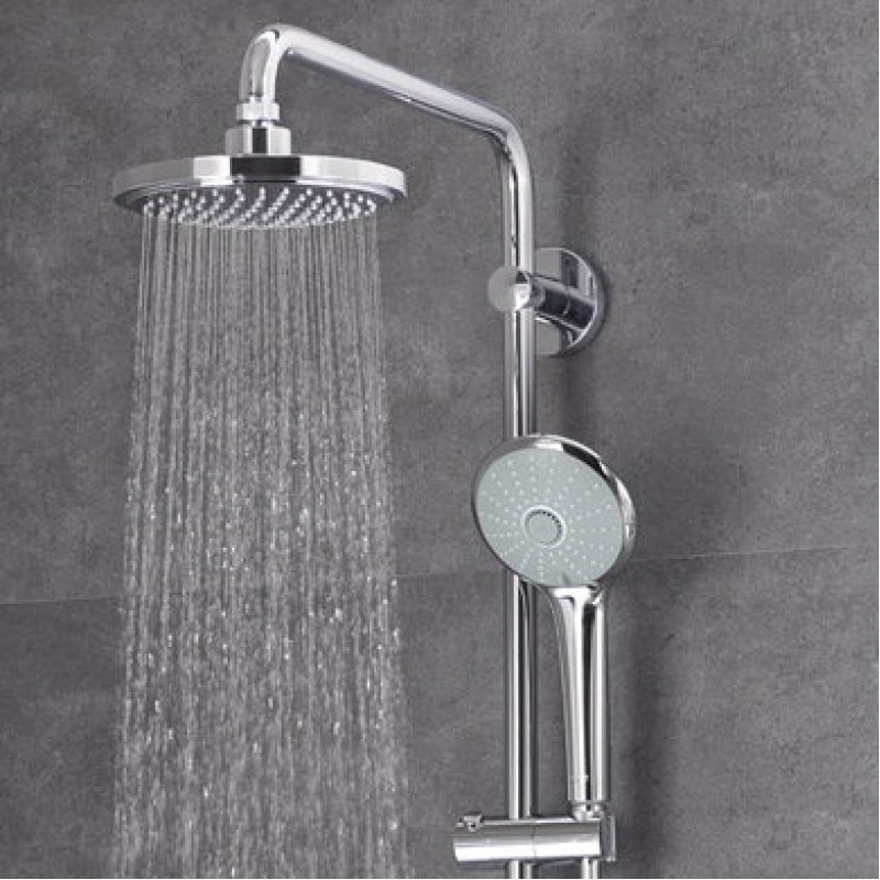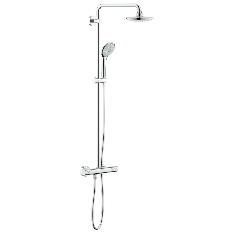 Разнообразие режимов струи, интеллектуальные характеристики и современный дизайн - душевая система GROHE Euphoria 180Представляем душевую систему GROHE Euphoria 180 с термостатом. В этом душе, который наполнен возможностями, главное - ваш собственный выбор. Верхний душ Euphoria Cosmopolitan 180 мм расслабит вас с помощью обволакивающего и мягкого режима Rain. Технология GROHE DreamSpray гарантирует, что поток из каждой душевой форсунки будет одинаковым. Душевой кронштейн поворачивается на 180˚ для максимального комфорта. Ручной душ Euphoria 110 Massage включает в себя 3 разных режима струи: нежный Rain, водосберегающий SmartRain и восстанавливающий Massage. Без труда переключайтесь между душами и контролируйте напор воды с GROHE AquaDimmer. Технология GROHE Turbostat гарантирует, что температура воды останется неизменной вне зависимости от скачков давления, а технология GROHE EcoJoy сокращает расход воды, сохраняя прежний уровень комфорта при принятии душа. Кнопка GROHE SafeStop ограничивает температуру воды до 38˚С, чтобы предотвратить ошпаривание, а внутренний водный канал WaterGuide предотвращает нагревание поверхности. Силиконовые душевые форсунки легко чистятся от грязи и извести благодаря технологии SpeedClean. Ослепительная хромовая поверхность GROHE StarLight устойчива к царапинам и сохранит свой блеск на долгие годы.