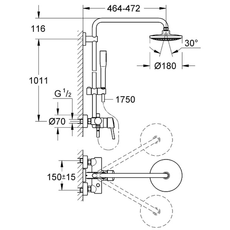Чертеж с размерами душевой стойки Grohe Concetto (23061001)