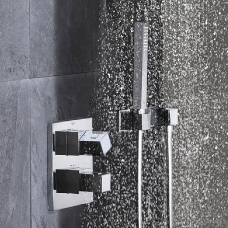 Встраиваемый термостат для душа, выполненный в философии минимализма, - сочетание дизайнерского стиля и премиального качестваДизайнерский стиль в сочетании с роскошным душем! Набор для душа Grohtherm Cube Perfect Shower включает в себя роскошный верхний душ Rainshower 230 мм и ручной душ Euphoria Cube. Поскольку внутренняя часть спрятана в стену, это решение подойдет для тех, кто предпочитает минимализм в ванной. Набор также оснащен передовыми технологиями GROHE. В мгновение ока технология GROHE TurboStat предоставит вам воду желаемой температуры, а технология DreamSpray гарантирует, что напор воды будет одинаковым из каждой душевой форсунки. Набор включает в себя различные режимы струи: верхний душ - режим PureRain, а ручной душ - бодрящий и мощный режим Normal. Силиконовые форсунки душа легко очистить от грязи или извести благодаря технологии SpeedClean. Функция GROHE SafeStop не позволит пользователям - особенно детям - включить слишком горячую воду. Технология EcoJoy уменьшит расход воды на 40% без ущерба для комфорта от принятия душа - она сэкономит и воду, и деньги. Многослойное покрытие GROHE StarLight, устойчивое к царапинам, сохранит свой блеск на долгие годы. Внутренний водный канал WaterGuide предотвратит нагревание поверхности душа.