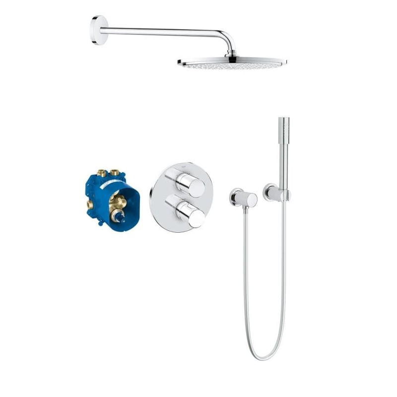 Роскошный термостат GROHE для душа - идеальное сочетание дизайнерского стиля и премиального качестваСила, роскошь и дизайнерский стиль! Набор для душа Grohtherm 3000 Cosmopolitan Perfect Shower включает в себя роскошный верхний душ Rainshower Cosmopolitan 310 мм и ручной душ Sena. Поскольку внутренняя часть спрятана в стену, это решение подойдет для тех, кто предпочитает минимализм в ванной. Набор также оснащен передовыми технологиями GROHE. В мгновение ока технология GROHE TurboStat предоставит вам воду желаемой температуры, а технология DreamSpray гарантирует, что напор воды будет одинаковым из каждой душевой форсунки. Набор включает в себя различные режимы струи: верхний душ - режим PureRain, а ручной душ - бодрящий и мощный режим Normal. Силиконовые форсунки душа легко очистить от грязи или извести благодаря технологии SpeedClean. Функция GROHE SafeStop не позволит пользователям - особенно детям - включить слишком горячую воду. Технология EcoJoy уменьшит расход воды на 40% без ущерба для комфорта от принятия душа - она сэкономит и воду, и деньги. Многослойное покрытие GROHE StarLight, устойчивое к царапинам, сохранит свой блеск на долгие годы. Внутренний водный канал WaterGuide предотвратит нагревание поверхности душа.