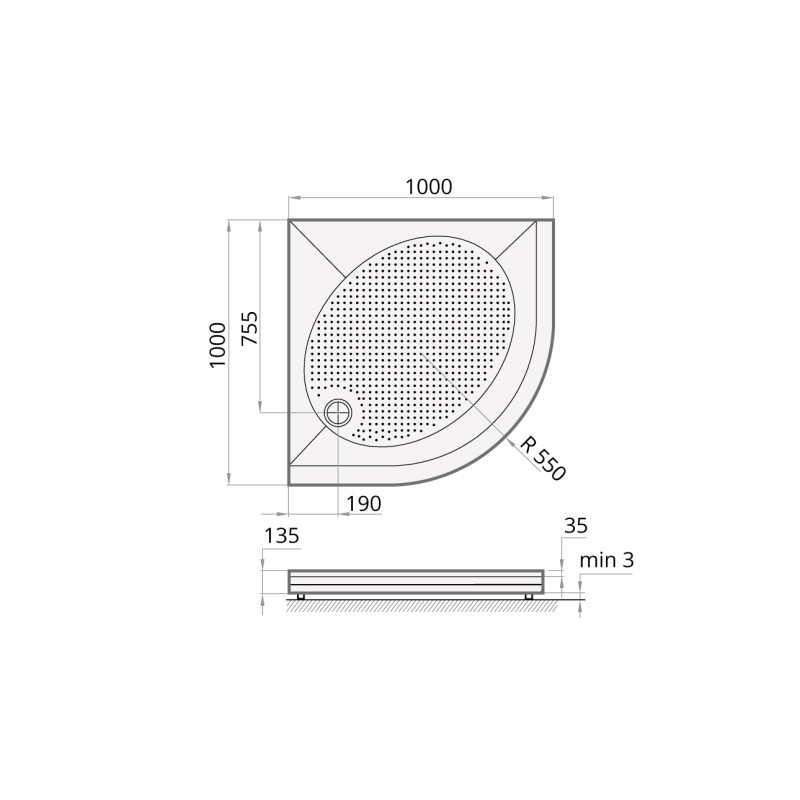 Полукруглый душевой поддон DPARTRO100/00 из литого камня с противоскользящей поверхностью имеет радиус 55 градусов, размер 100x100 см и сливное отверстие диаметром 90 мм, плавную форму и небольшую глубину. Поддон РАА ART RO 100 R550 можно монтировать несколькими способами: установка на ножках с использованием декоративной панели, которая приобретается отдельно, или выполнять монтаж непосредственно на пол.