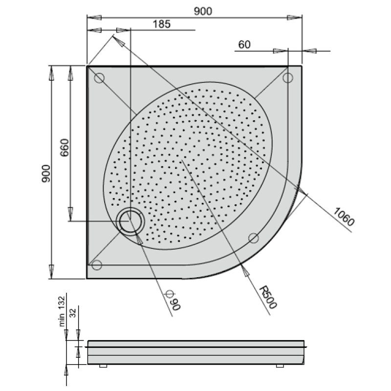 Полукруглый душевой поддон DPARTRO90R500/00 из литого камня с противоскользящей поверхностью имеет радиус 50 градусов, размер 90x90 см и сливное отверстие диаметром 90 мм, плавную форму и небольшую глубину. Поддон РАА ART RO 90 R500 можно монтировать несколькими способами: установка на ножках с использованием декоративной панели, которая приобретается отдельно, выполнять монтаж непосредственно на пол, или встраиваемый монтаж.