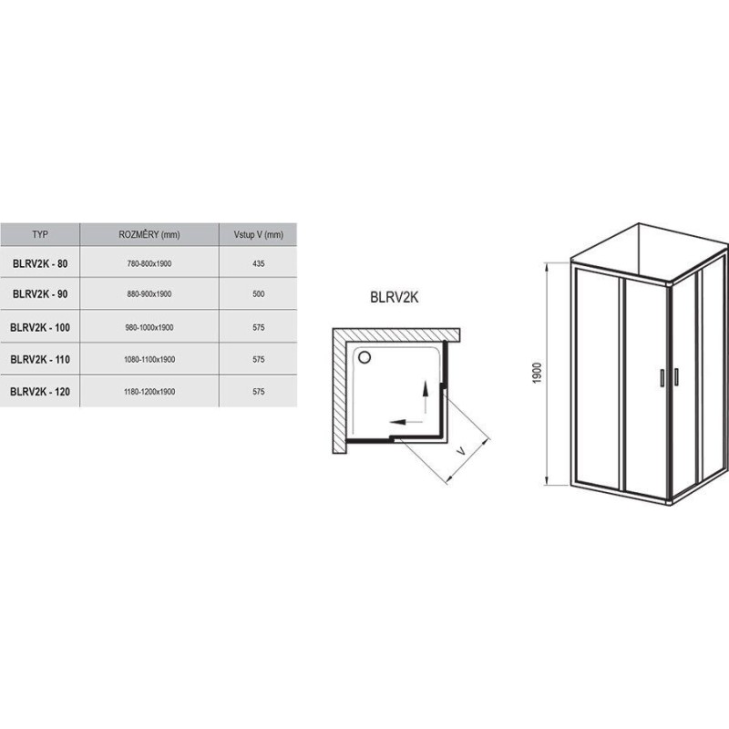 - Комбинация элементов душевого уголка BLRV2K разных размеров позволит создать квадратный или прямоугольный душевой уголок c угловым входом. Доступные размеры элементов: 80, 90, 100, 110, 120 см.