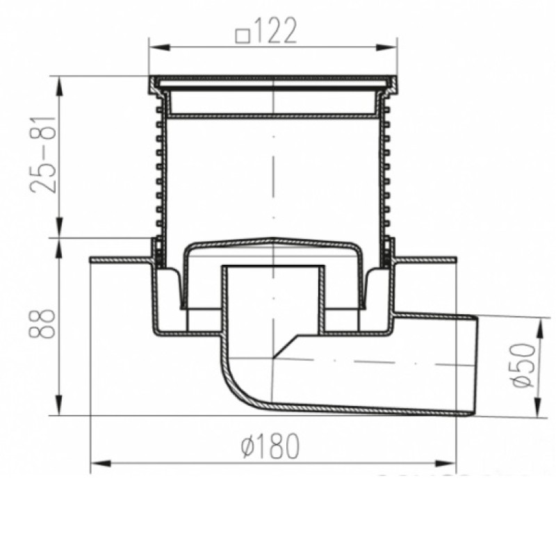 G425 N XL Двухкорпусный трап с гор. подключением DN50, h-113-169 mm, решетка Квадраты, с сухим сифоном