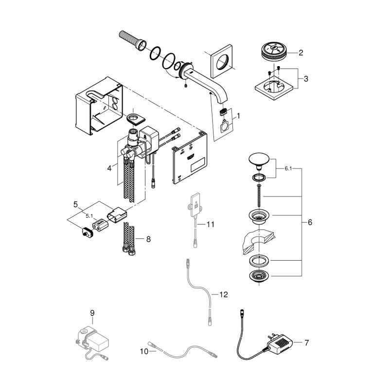 Включая блок питания 65790000 (Блок питания для ИК-смесителей GROHE (230 В))
