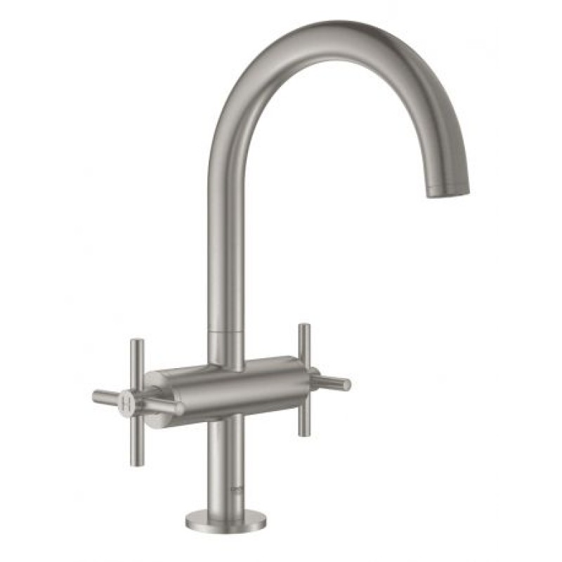 Утонченный, элегантный с аккуратно изогнутым изливом Двухвентильный смеситель для раковины GROHE Atrio с прекрасно осязаемыми крестообразными рукоятками - идеальное сочетание линий, пропорций и роскошного покрытия.