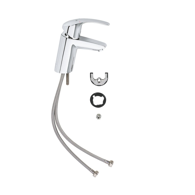 Установка и подключение смесителя к воде не вызывает проблем. В комплекте со смесителем поставляются шланги гибкой подводки. Их длина 350 мм и стандарт подключения 3/8 дюйма. Кроме гарантийного талона и простой и понятной инструкции, смеситель укомплектован системой быстрого монтажа GROHE QuickFix.