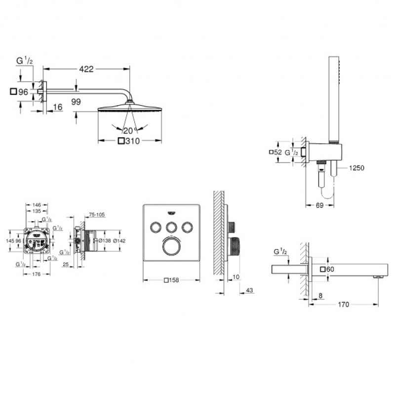 Плитка керамогранит Grohe Grohtherm SmartControl Душевая система с Rainshower 310 Mono Cube (26405SC2) для пола