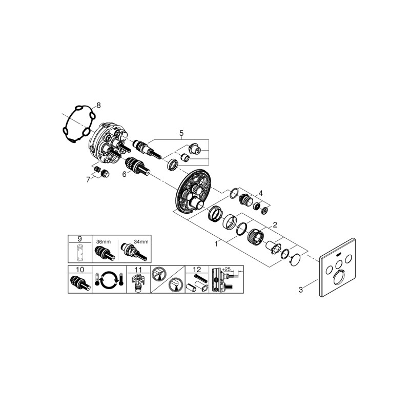 - с настенными розетками GROHE QuickFix® (скрытые эксцентрики, уплотнители, крепления)