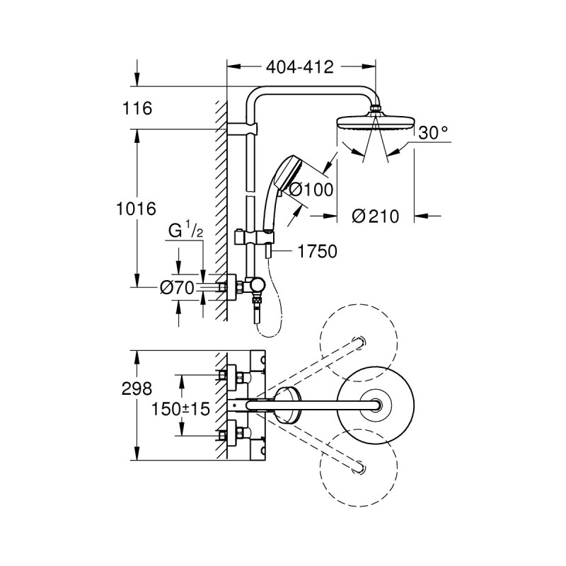 Технология GROHE DreamSpray гарантирует, что поток из каждой душевой форсунки будет одинаковым, что отлично отражается на верхнем душе Tempesta 210 мм и его обволакивающего режима струи Rain. Душевой кронштейн длиной 390 мм имеет диапазон поворота 180° для большего удобства.