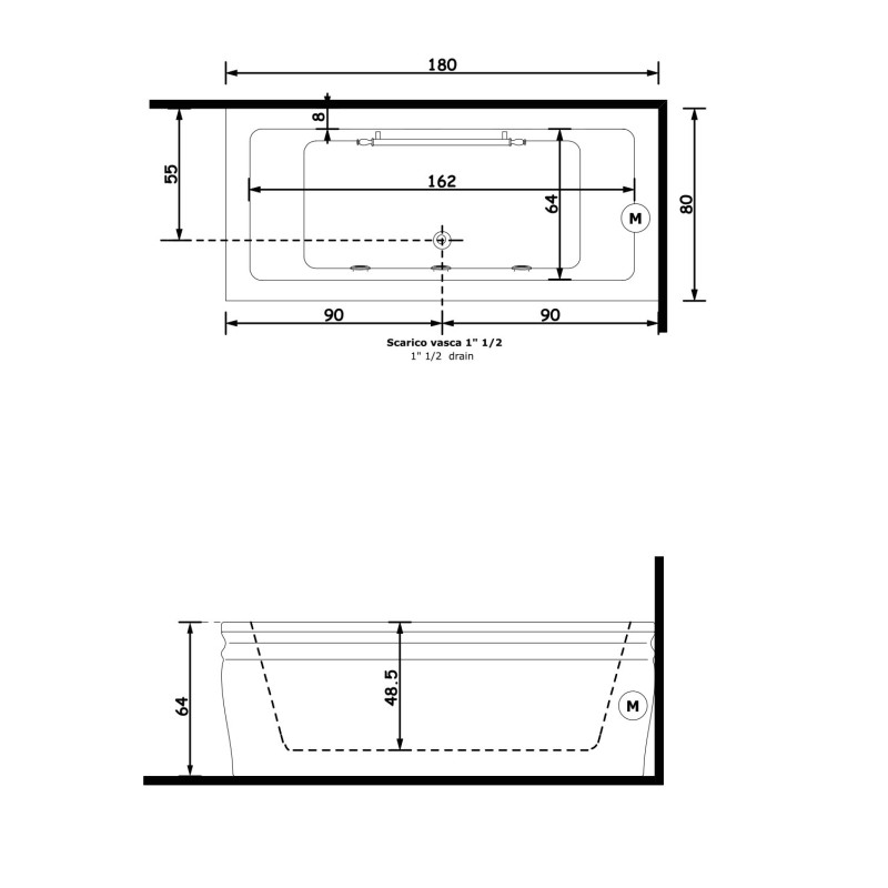 Ванна 180x80xh65 см. Максимальная комплектация. Невидимая система гидромассажа, Датчик уровня, Система дезинфекции, Стабилизатор температуры воды, Хромотерапия, Радио, Аудиовход для iPod/CD, Пульт дистанционного управления функциями.