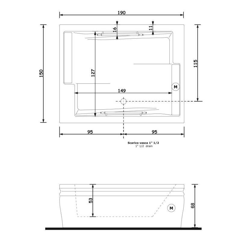 Ванна 190x150xh68 см. Максимальная комплектация. Невидимая система гидромассажа, Датчик уровня, Система дезинфекции, Стабилизатор температуры воды, Хромотерапия, Радио, Аудиовход для iPod/CD, Пульт дистанционного управле...