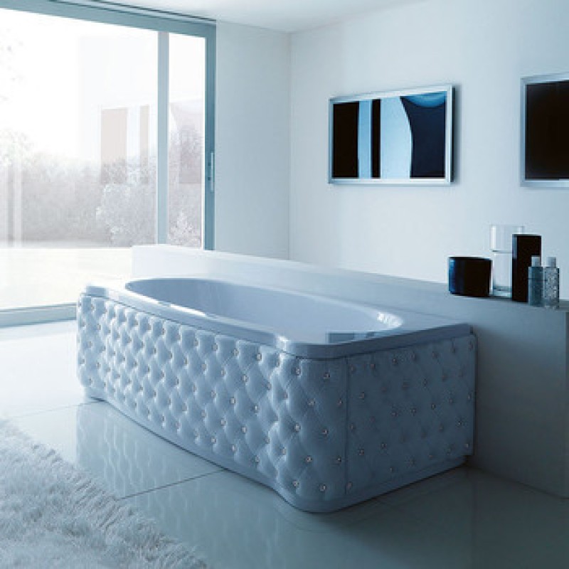 Ванна 170x85xh57 см. Максимальная комплектация. Невидимая система гидромассажа, Датчик уровня, Система дезинфекции, Стабилизатор температуры воды, Хромотерапия, Радио, Аудиовход для iPod/CD, Пульт дистанционного управления функциями. Отделеп панелей из кожи с отделкой капитоне с пуговицами сваровски.