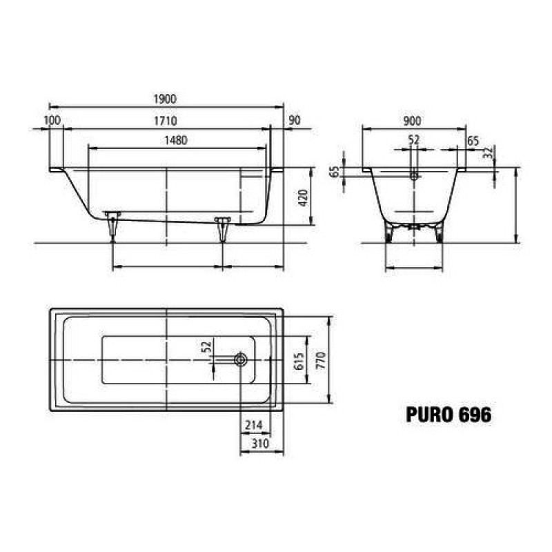 Видеообзор стальной ванны Kaldewei Puro 190x90 (259600010001) Чертеж с размерами стальной ванны Kaldewei Puro 190x90 (259600010001)
