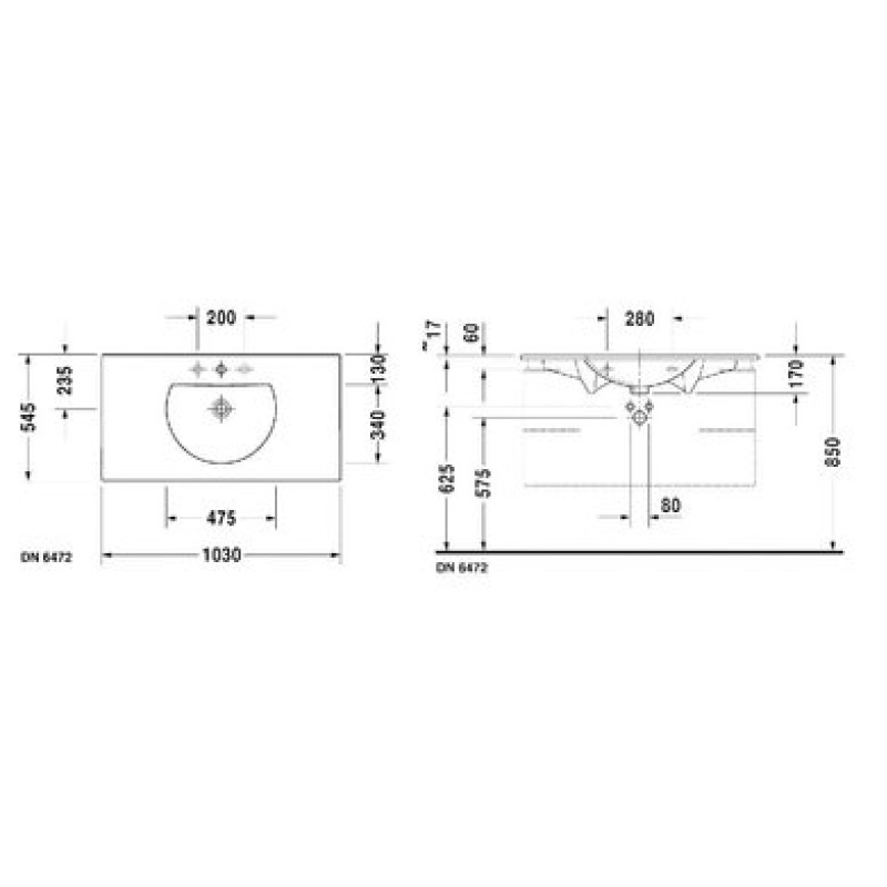 Схема с размерами керамической раковины Duravit Darling New (0499100000)