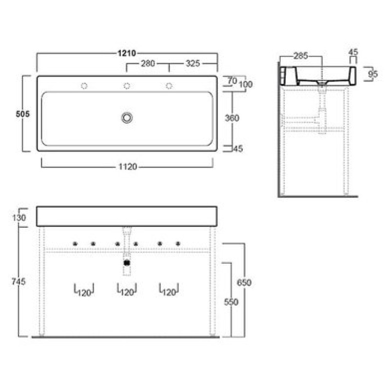 Описание керамической раковины Simas Frozen (U 120) размер 1210x505х130 мм вес 34 кг цвет - белый материал - керамика намеченные центральное отверстие под смеситель, справа и слева без перелива установка: накладная на к...