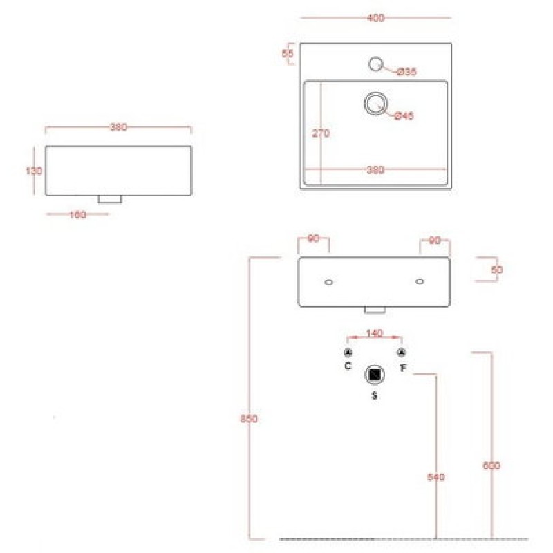 Схема с размерами керамической раковины Artceram Quadro (QUL005 01; 00)