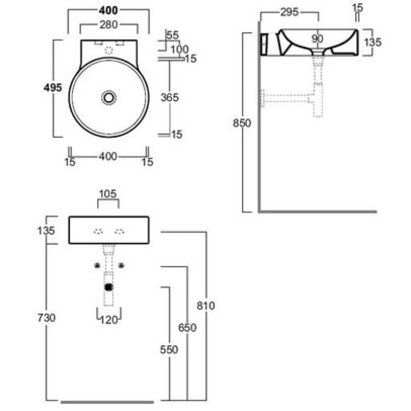 Схема с размерами керамической раковины Simas Flow (FL 14)