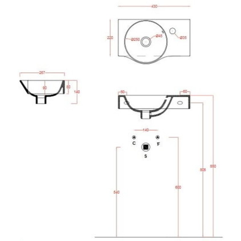 Схема с размерами керамической раковины Artceram Lavamani (LML001 01; 00)