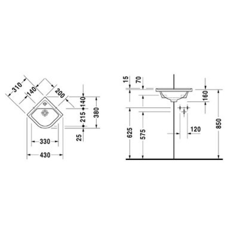 Схема с размерами керамической раковины Duravit Starck 3 (0752440000)