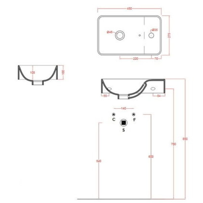 Схема с размерами керамической раковины Artceram Lavamani (LML003 01; 00)