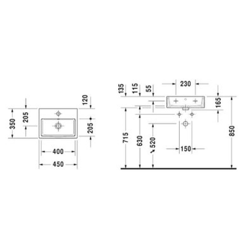 Схема с размерами керамической раковины Duravit Vero Air (0724450027)