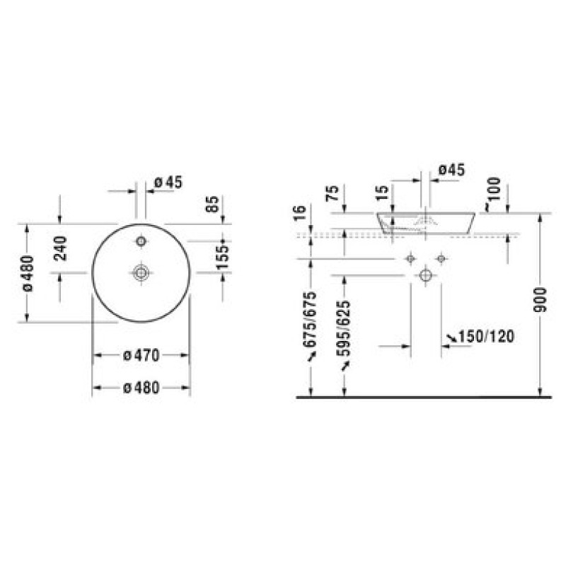 Схема с размерами керамической раковины Duravit Cape Cod (2328480000)