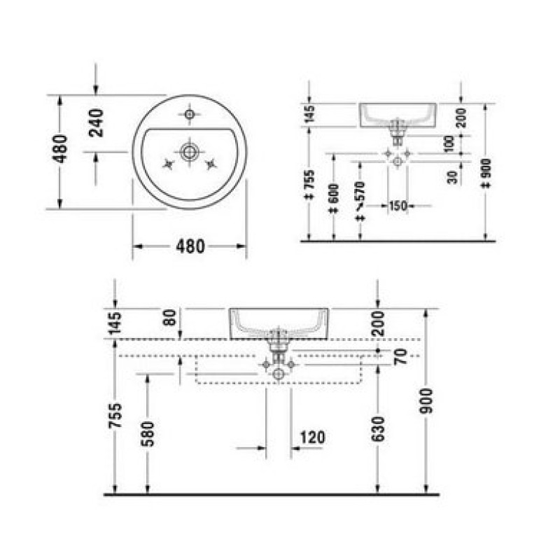 Схема с размерами керамической раковины Duravit Starck 1 (0446480000)