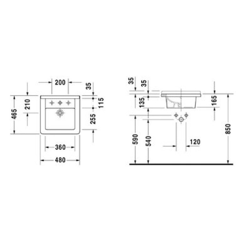 Схема с размерами керамической раковины Duravit Starck 3 (0303480022)