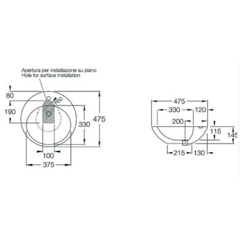 Схема с размерами керамической раковины Hatria Happy Hour 02:00 (Y0M601)