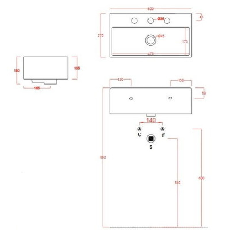 Схема с размерами керамической раковины Artceram Quadro (QUL001 01; 00)