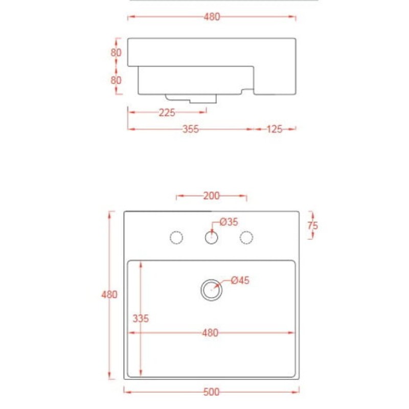 Схема с размерами керамической раковины Artceram Quadro (QUL004 01; 00)