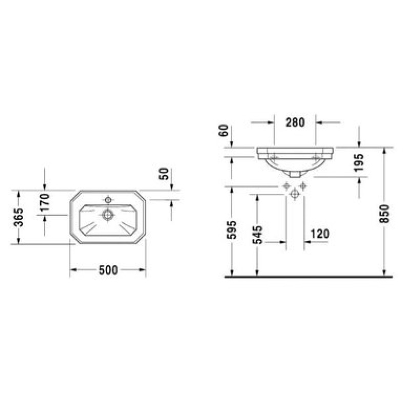 Схема с размерами керамической раковины 50 см Duravit 1930 (0785500000)