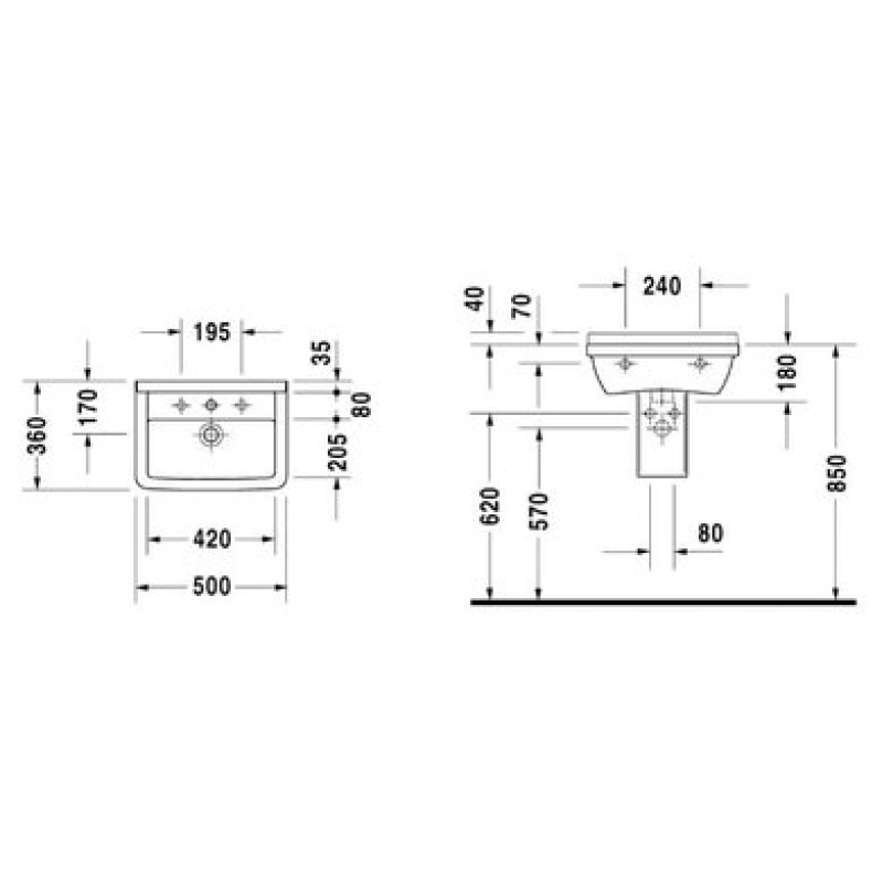 Схема с размерами керамической раковины Duravit Starck 3 (0300500000)