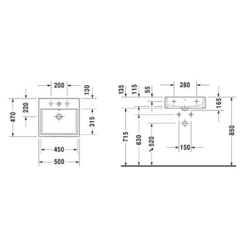 Схема с размерами керамической раковины Duravit Vero Air (2350500027)