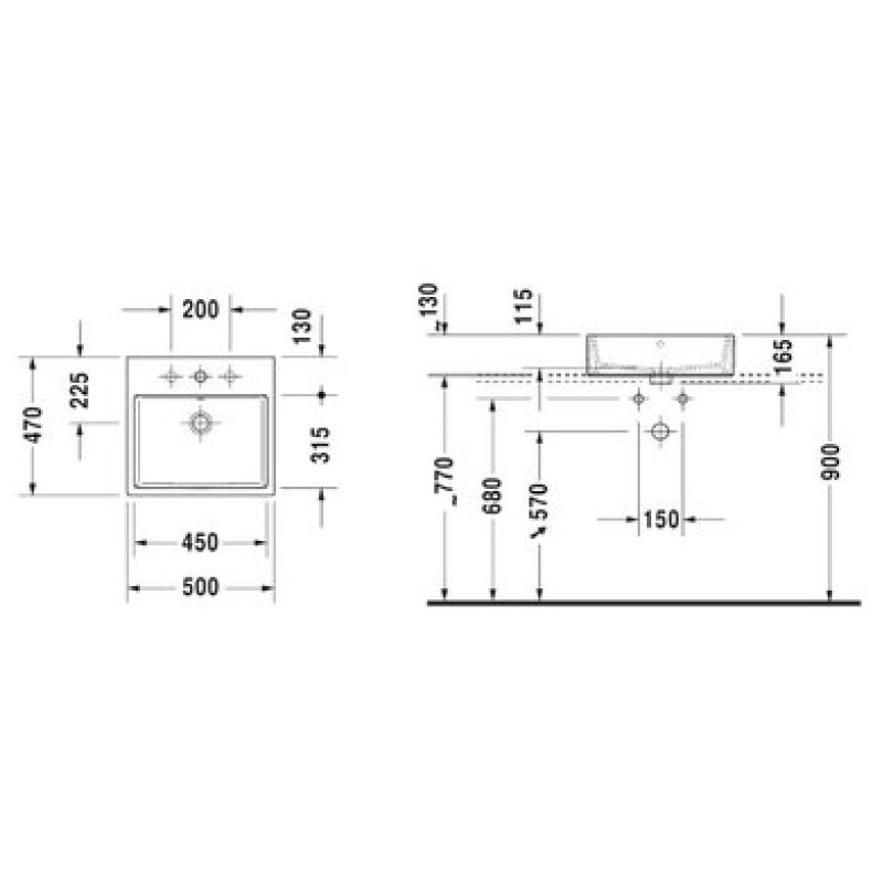 Схема с размерами керамической раковины Duravit Vero Air (2352500041)