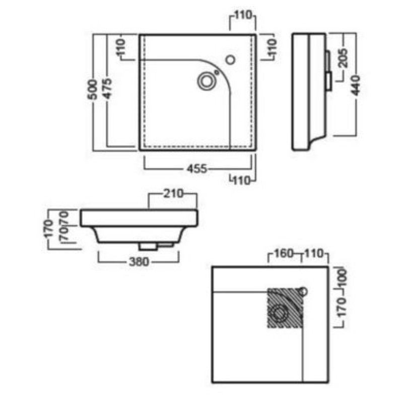 Схема с размерами керамической раковины Hatria Grandangolo (YXES01)