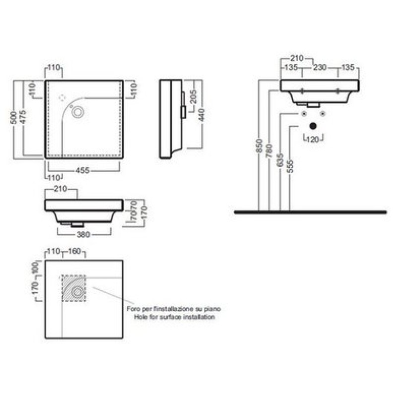Схема с размерами керамической раковины Hatria Grandangolo (YXFA01)