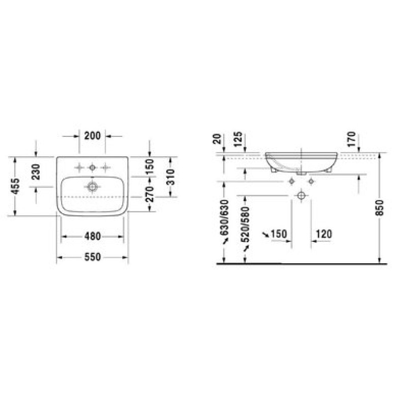 Схема с размерами керамической раковины Duravit DuraStyle (0375550000)