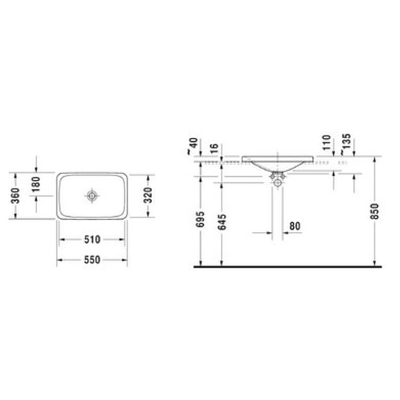 Схема с размерами керамической раковины Duravit P3 Comforts (0377550000)