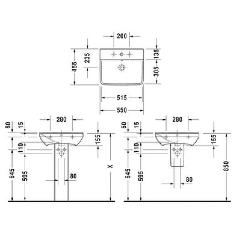 Схема с размерами керамической раковины Duravit P3 Comforts (2331550000)
