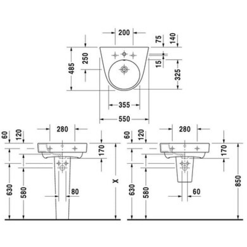 Схема с размерами керамической раковины Duravit Starck 2 (2323550000)