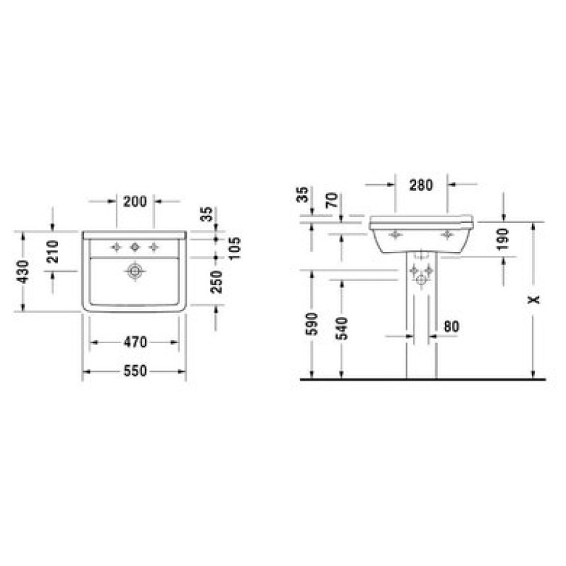 Схема с размерами керамической раковины Duravit Starck 3 (0300550000)
