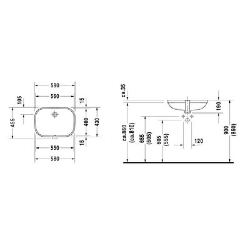 Схема с размерами керамической раковины Duravit D-Code (0338560000)