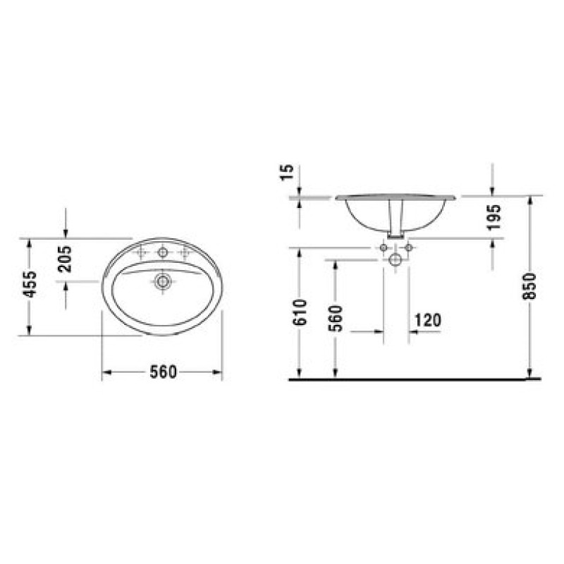 Описание керамической раковины Duravit Duraplus (0472560000) размер 560x455х195 мм вес 8,4 кг цвет - белый материал - керамика для встраивания сверху с центральным отверстием под смеситель премаркированная под 3 отверст...