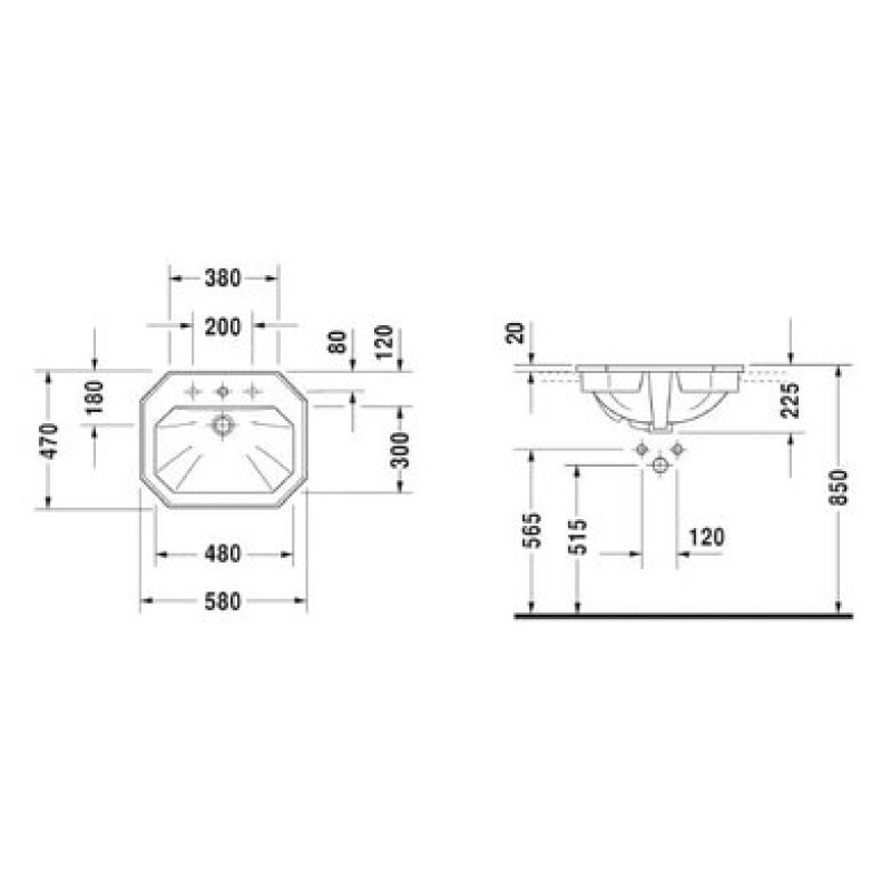 Схема с размерами керамической раковины Duravit 1930 (0476580000)