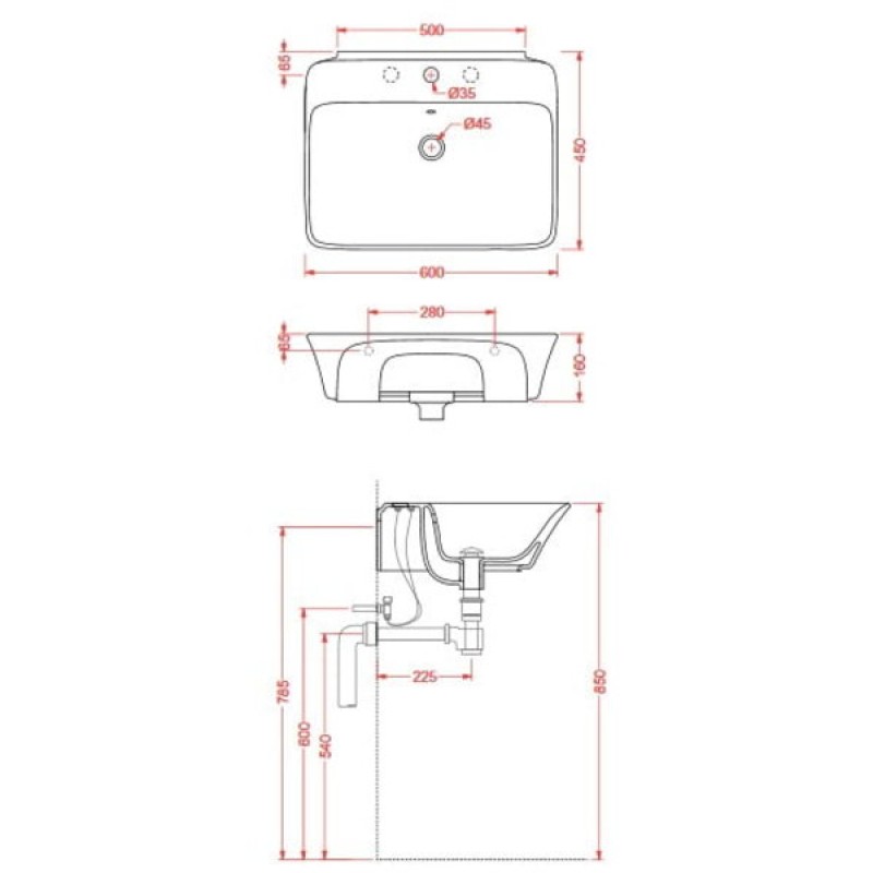 Схема с размерами керамической раковины Artceram Cow (CWL002 01; 00)